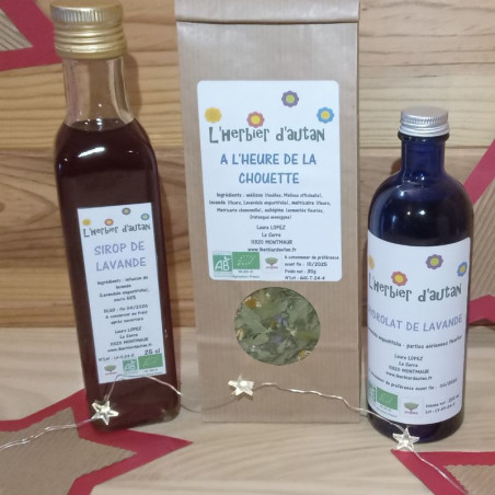 - une tisane "A l'heure de la chouette" (mélisse, lavande, matricaire, aubépine) - poids net 30g