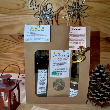 - une tisane de Noël (cynorrhodon, sauge officinale, ronce, origan, thym citron, souci, bleuet) - poids net 35g